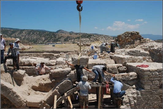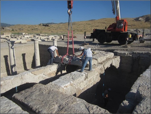 5., 7. ve 10. kemer dizilerinin yıkılmış durumdaki güney kemerleri ve 1. kemer dizisinin bazı bloklarının kaymasından dolayı denge mekanizmasını kaybederek batıya doğru eğrilmiş durumdaki güney kemerinin yapı blokları, çizim ve fotoğraflarla belgelendikten sonra vinç yardımıyla tasnif alanına taşınmıştır (Figür 4). 5. ve 10. kemer dizilerinin kaldırılan kemer bloklarından tekrar kullanılamayacak kadar bozulmuş ve eksik olan bazı taşlarının yerine orijinaline uygun olarak yeni taşlar kesilerek hazırlanmıştır.