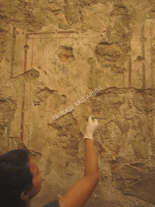 Mekân A olarak adlandırılan tabernanın duvarlarındaki fresklerin mevcut halleri fotoğraflarla belgelendikten sonra sıva ve fresklerin ana hatlarını ortaya çıkarmak ve uygulanacak işlemleri planlamak amacı ile sıva ve fresk yüzeylerinde ince kıllara sahip fırçalar ile kuru temizlik ve ardından da basınçsız su ile genel bir temizlik yapılmıştır. Temizliğin ardından tabakaları ve konturları tespit edilen fresklerin ince temizliğine geçilerek tabakalar arasındaki kir ve topraklar temizlenmiştir (Figür 1). Temizlik işleminin ardından bordür ve dolgu işlemlerine başlanmıştır. Bordür ve dolgular orijinal harçtan daha düşük seviyede yapılmıştır (Figür 2).