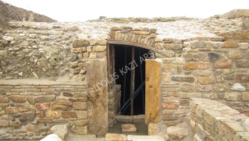 Yapı girişinde, kapı sövelerinin üzerinde tonozun yıkılan kısmını
