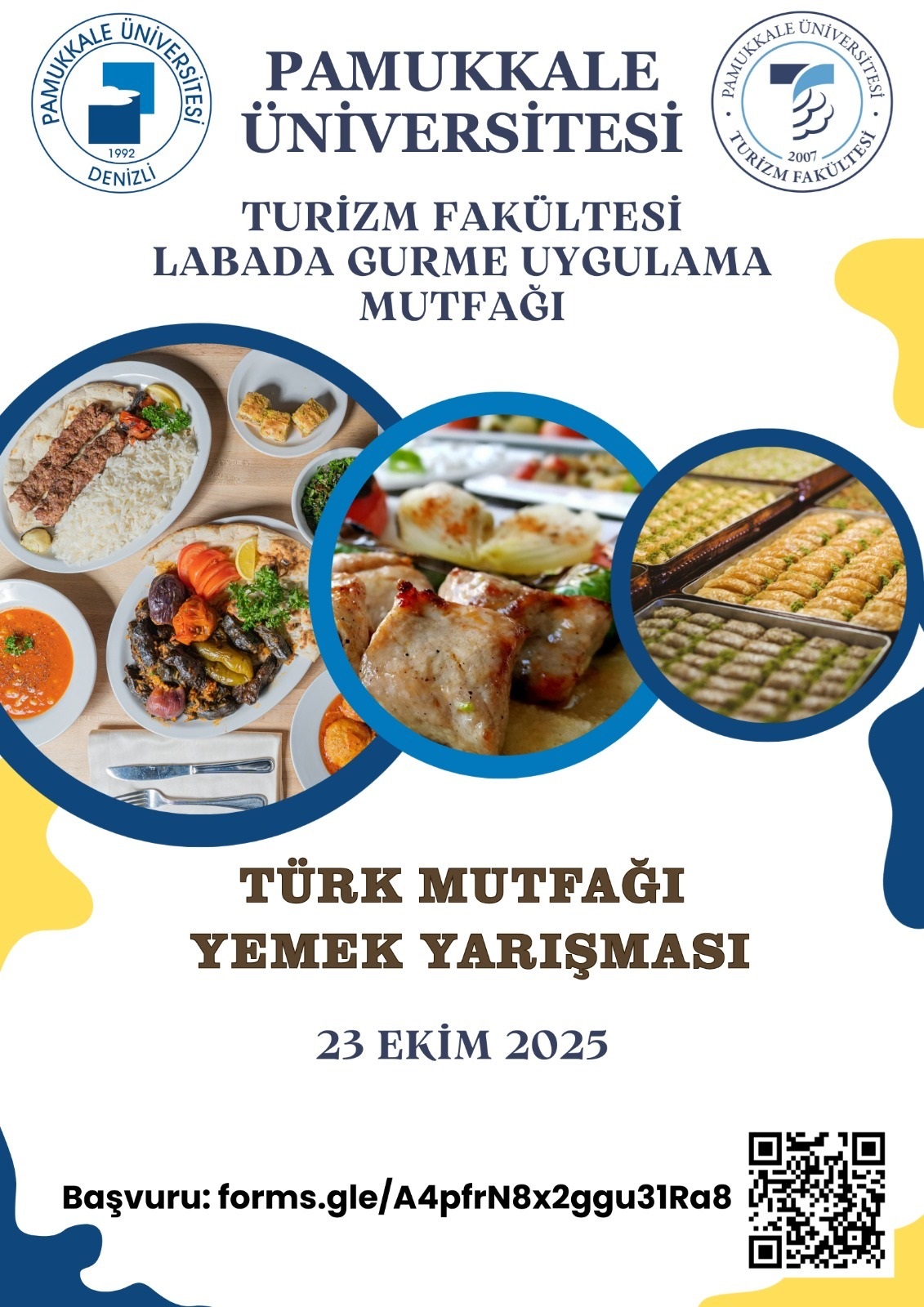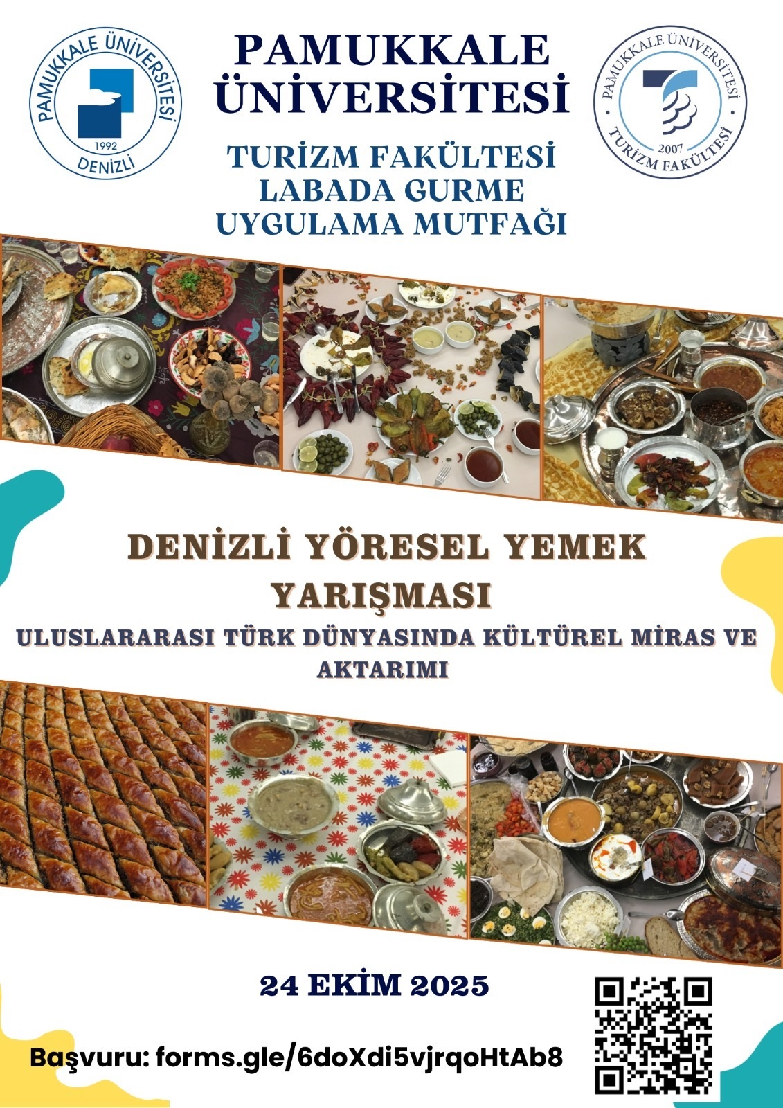 DENİZLİ YÖRESEL YEMEK YARIŞMASI Yarışma 23 Ekim 2025 - 24 Ekim 2025 PAÜ Turizm Fakültesi DENİZLİ YÖRESEL YEMEK YARIŞMASI Uluslararası Türk Dünyasında Kültürel Miras ve Aktarımı Sempozyumu kapsamında Türk Mutfağı ve Denizli Yöresel Yemek Yarışması düzenlenecektir. Detaylı bilgi için afişte yer alan QR kodunu okutabilirsiniz.