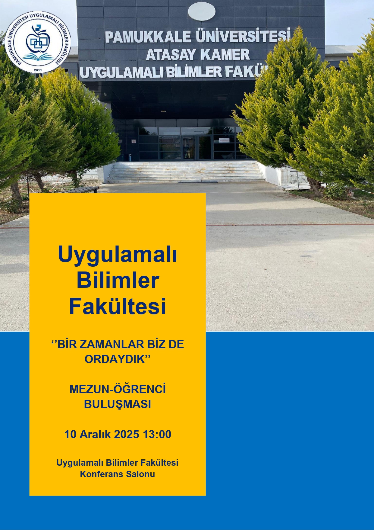 ''Bir Zamanlar Biz de Ordaydık'' Mezun Öğrenci Buluşması Etkinlik 10 Aralık 2025 Uygulamalı Bilimler Fakültesi Sahne Alanlar: Mezunlarımız, Öğretim Elemanlarımız Organizatör: Uygulamalı Bilimler Fakültesi