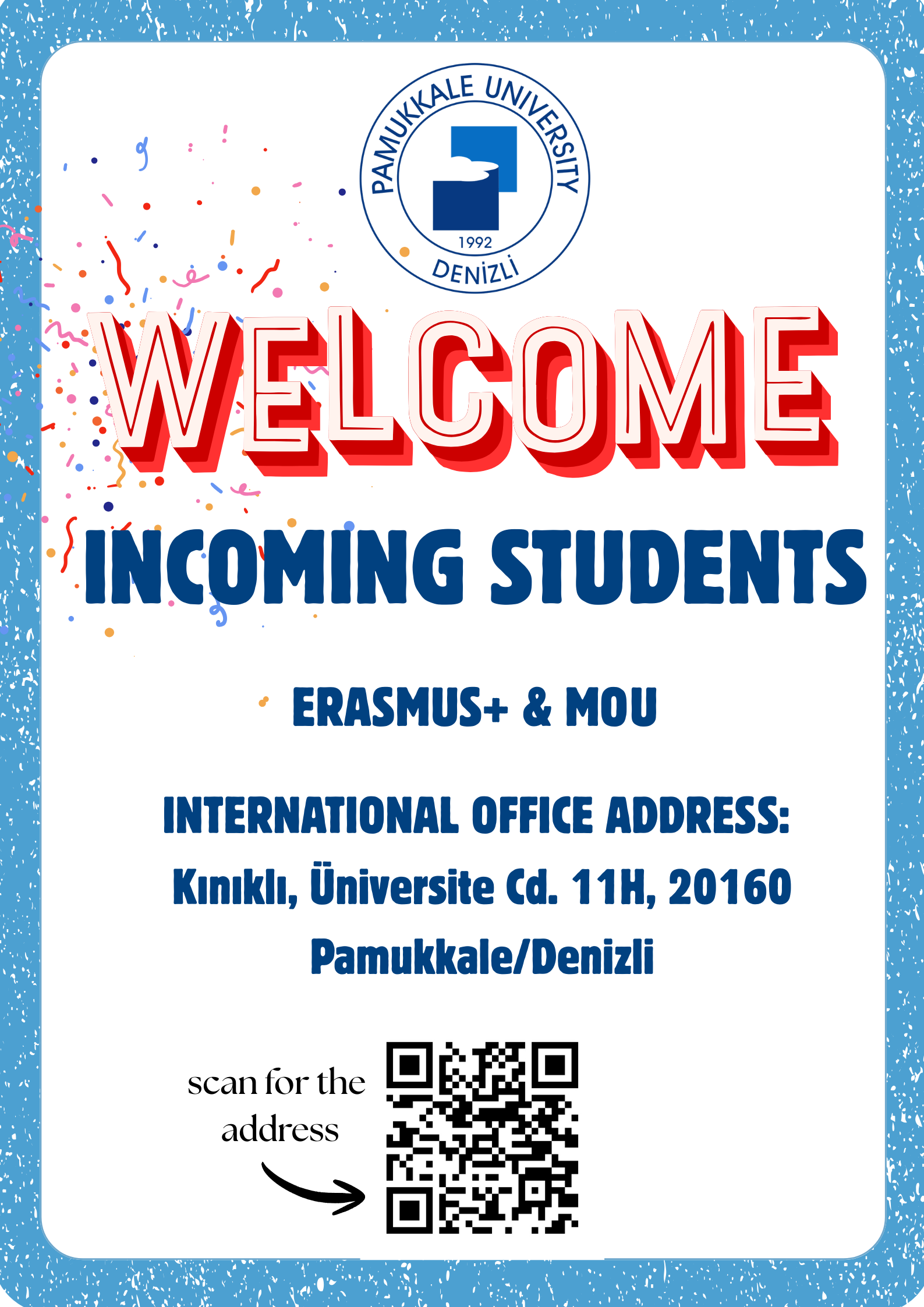 Adres: Pamukkale Üniversitesi, Kınıklı Mahallesi, Üniversite Caddesi, Öğrenci Toplulukları Çalışma Merkezi, KAT:1, Uluslararası İlişkiler Koordinatörlüğü, No: 11/H, 20160, Pamukkale/DENİZLİ