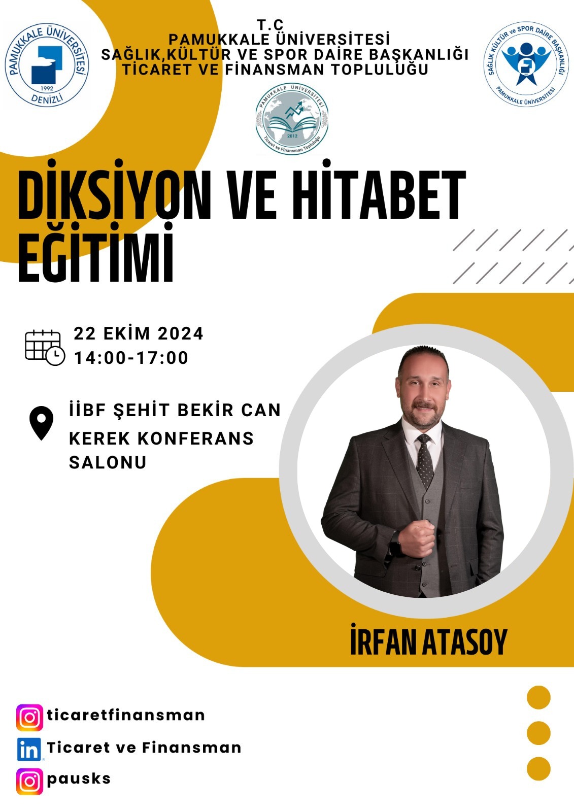 ‘‘Diksiyon ve Hitabet Eğitimi’’ Konferans 22 Ekim 2024 İktisadi ve İdari Bilimler Fakültesi 22 Ekim 2024 tarihinde Fakültemizde yapılacak olan ‘‘Diksiyon ve Hitabet Eğitimi’’ konulu etkinliğimize akademisyenlerimizi ve öğrencilerimizi bekleriz.
