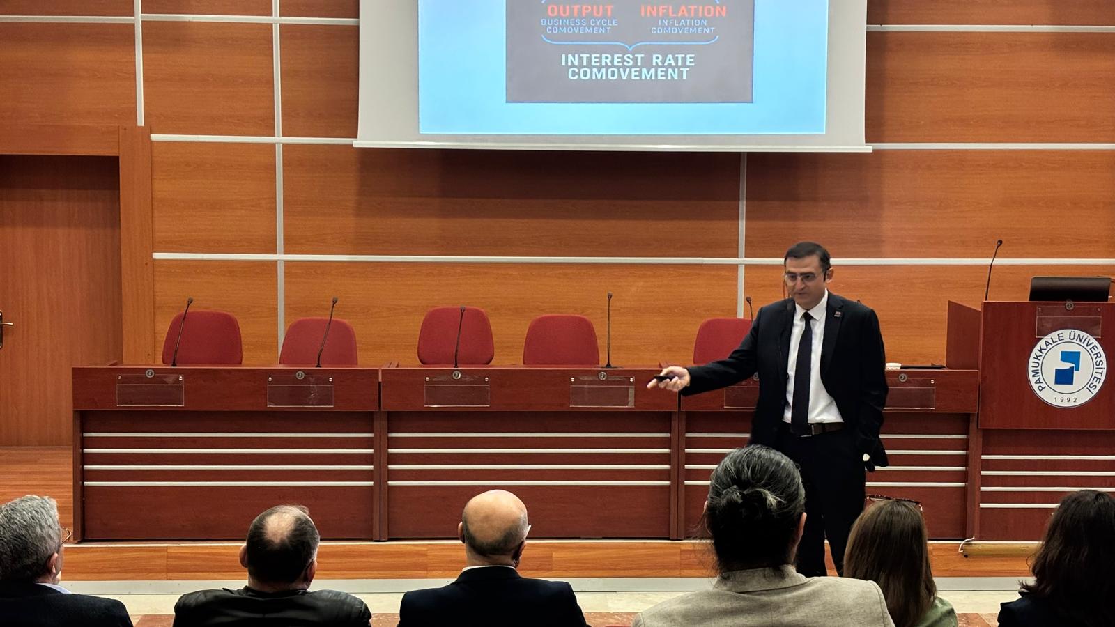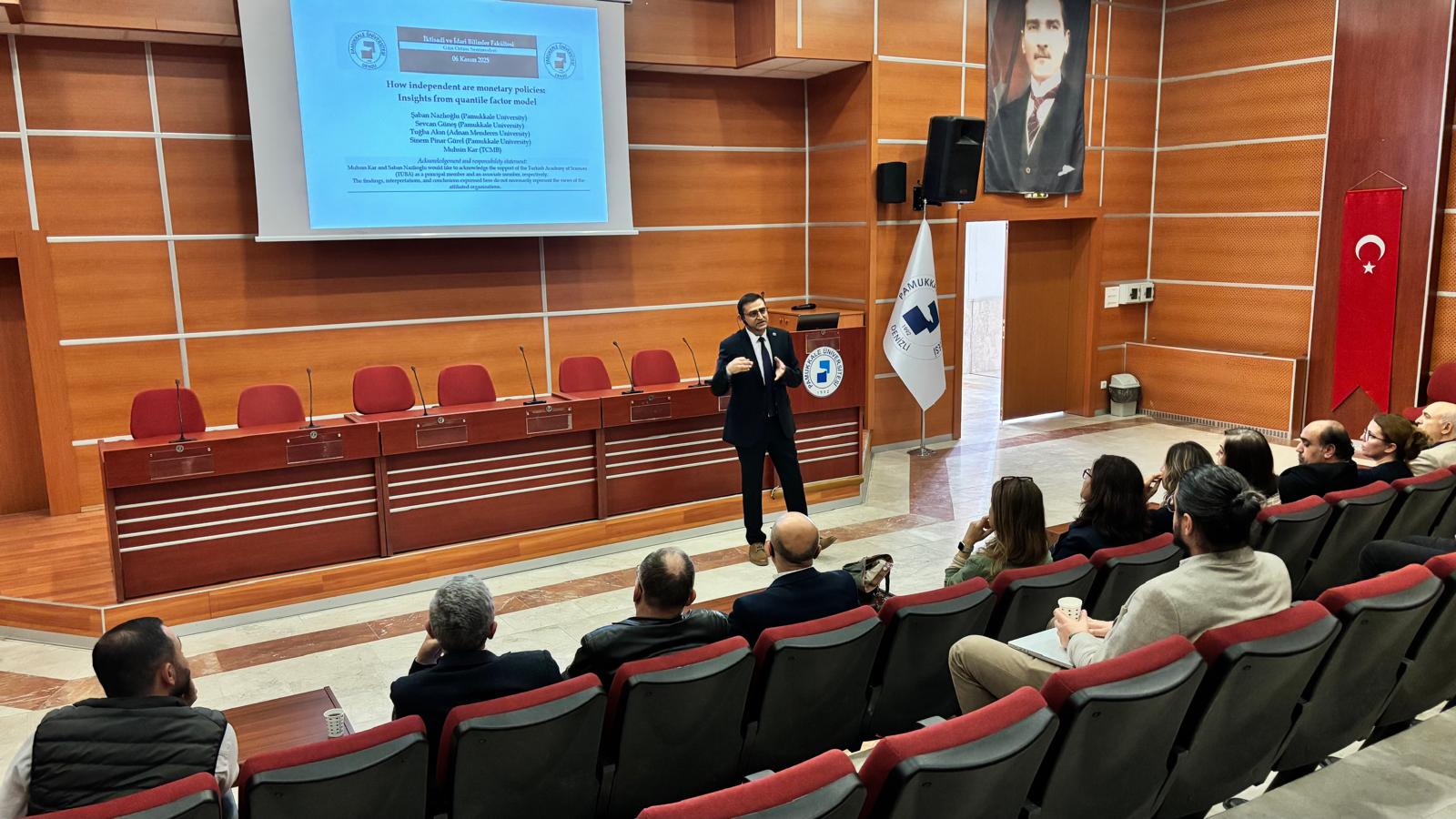 Prof. Dr. Şaban NAZLIOĞLU, sunumunda merkez bankası bağımsızlığını ele alarak enflasyon hedeflemesi, döviz kuru politikaları ve bu konuların finansal istikrar ile ilişkisini kapsamlı bir şekilde açıkladı. Profesör NAZLIOĞLU, özellikle Türkiye’nin de dahil olduğu gelişmekte olan ülkelerde para politikası kararlarındaki hareket alanının küresel enflasyon konjonktürüne bağlı olarak daralabildiğini vurgulayarak katılımcıların sorularını yanıtladı.