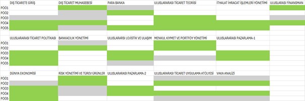 Uluslararası Ticaret ve Finansman programı, programa özgü derslerle programa özgü ölçütlerin eşleşme matrisini hazırlayarak, programa özgü ölçütlere nasıl ulaşıldığını tanımlamıştır. Tablo 2'de yeşil renk ile belirtilen hücreler güçlü ilişkiyi, gri renkli hücreler zayıf ilişkiyi gösterirken diğer hücreler (beyaz) ise ilişki olmadığını ifade etmektedir.
