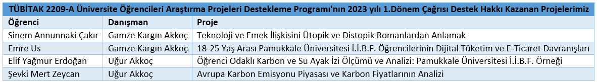 Uluslararası Ticaret ve Finansman Bölümü öğrencileri, TÜBİTAK 2209-A Üniversite Öğrencileri Araştırma Projeleri Destekleme Programı'nın 2023 yılı 1.Dönem Çağrısı kapsamında önemli bir başarı elde etmişlerdir. Pamukkale Üniversitesi’nden yapılan toplam 70 başvuru arasından 44 proje destek hakkı kazanırken İktisadi ve İdari Bilimler Fakültesi’nden destek almaya hak kazanan 6 projenin 4’ü Uluslararası Ticaret ve Finansman Bölümü öğrencilerine aittir. Öğrencilerimiz, bölüm öğretim elemanlarımız Doç. Dr. Uğur AKKOÇ ve Dr. Gamze KARGIN AKKOÇ danışmanlığında gerçekleştirdikleri proje önerileriyle kabul alarak deneyim kazanmaya devam ederken özgün çalışmalarını TÜBİTAK desteğiyle hayata geçirme şansını yakalamışlardır.