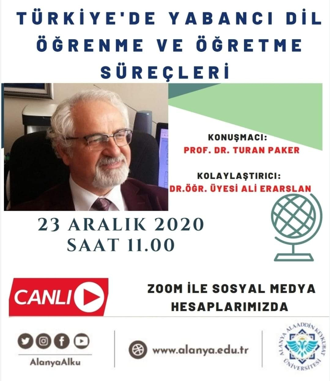 Anabilim Dalımız Öğretim Üyesi Prof. Dr. Turan PAKER Türkiye'de Yabancı Dil Öğrenme ve Öğretme Süreçleri isimli konuşmasıyla Alanya Üniversitesi Eğitim Fakültesi İngiliz Dili Eğitimi Anabilim Dalı Öğretim Elemanları ve Öğrencileri ile buluştu. Etkinlik videosuna aşağıdaki linkten ulaşabilirsiniz.