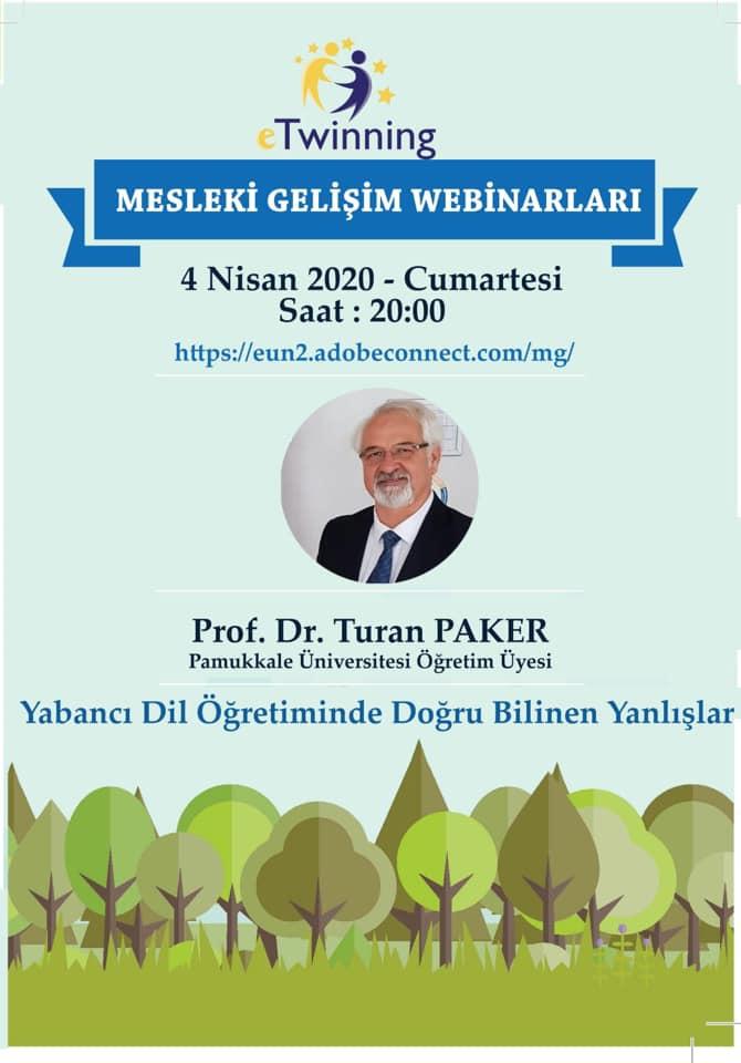 04.04.2020 ve 12.06.2020  tarihlerinde, Öğretmen Yetiştirme ve Geliştirme Genel Müdürlüğü'nün İngilizce Öğretmenlerine yönelik düzenlediği "CEFR Temelli Online Materyal Geliştirme" konusunda online Webinar, Öğretim Üyemiz Prof. Dr. Turan PAKER tarafından gerçekleştirilmiştir.Etkinlik videosuna aşağıdaki linkten ulaşabilirsiniz: