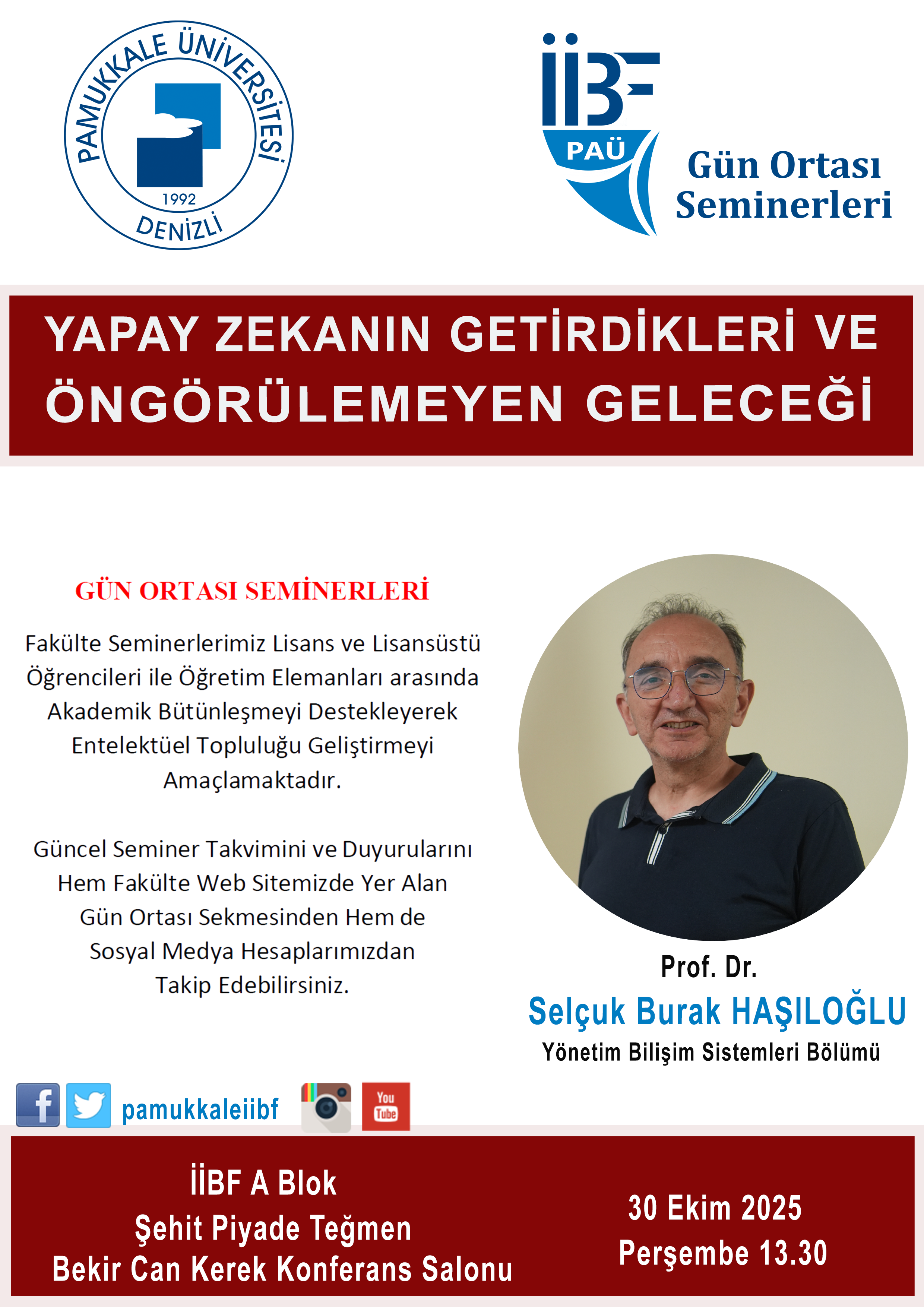 "Yapay Zekanın Getirdikleri ve Öngörülemeyen Geleceği" Seminer 30 Ekim 2025 İİBF A BLOK KONFERANS SALONU 30 Ekim 2025 tarihinde Fakültemizde yapılacak olan "Yapay Zekanın Getirdikleri ve Öngörülemeyen Geleceği" konulu Gün Ortası Seminerimize akademisyenlerimizi ve öğrencilerimizi bekleriz.