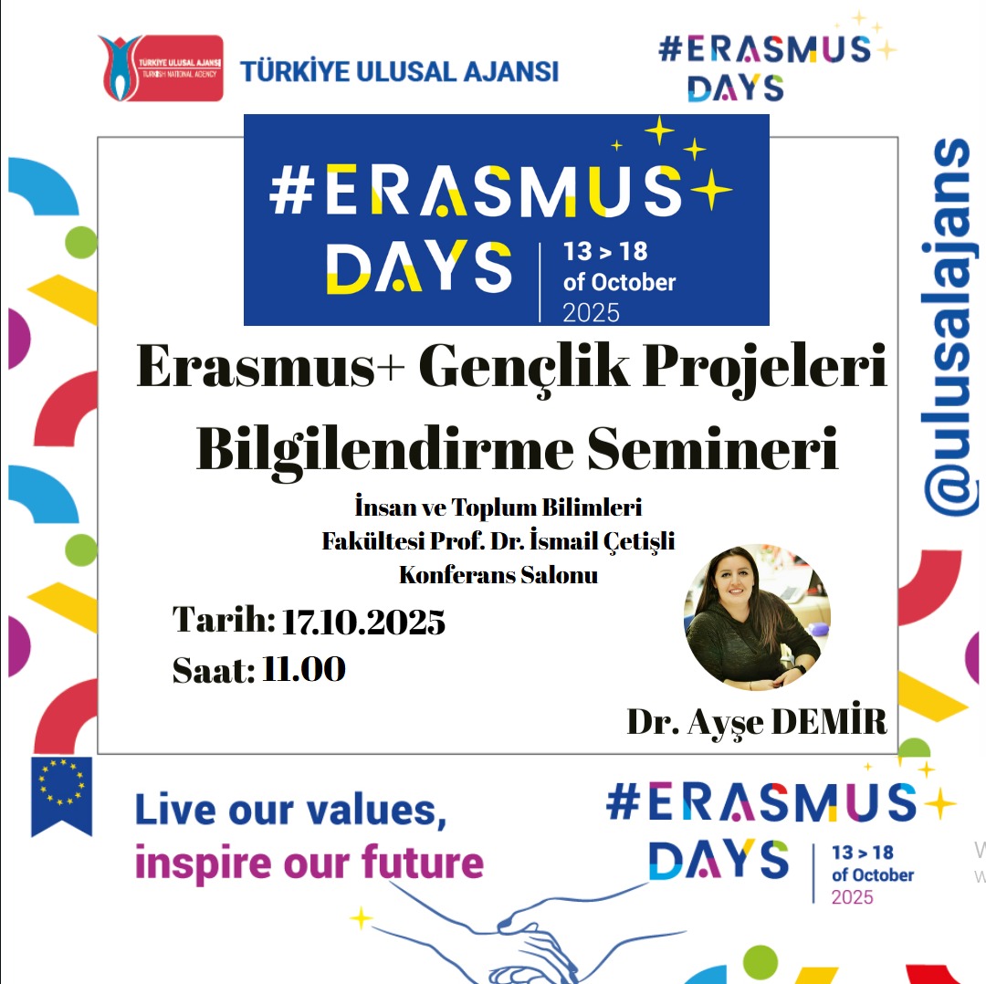 "Erasmus Days" kapsamında projeler ve yurtdışı fırsatları ile ilgili Öğr. Gör. Dr. Ayşe DEMİR Hocamız öğrencilerimiz için bir bilgilendirme semineri gerçekleştirilecektir.