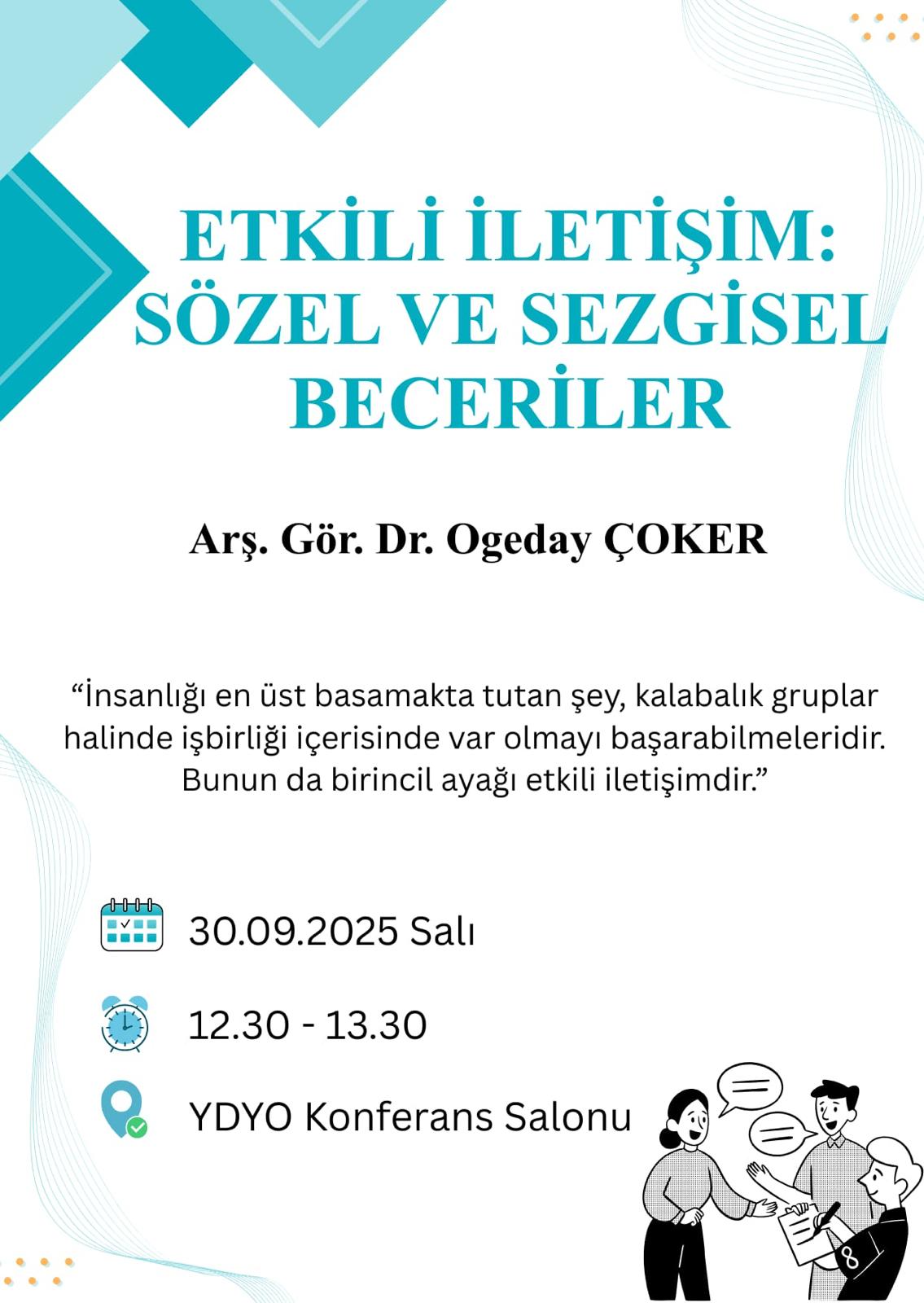Pamukkale Üniversitesi Yabancı Diller Yüksekokulu’nda Mesleki Gelişim Koordinatörlüğü organizasyonuyla İnsan ve Toplum Bilimleri Fakültesi’nden Arş. Gör. Dr. Ogeday ÇOKER tarafından 30.09. 2025 tarihinde “Etkili İletişim: Sözel ve Sezgisel Beceriler” isimli seminer gerçekleştirilmiştir.